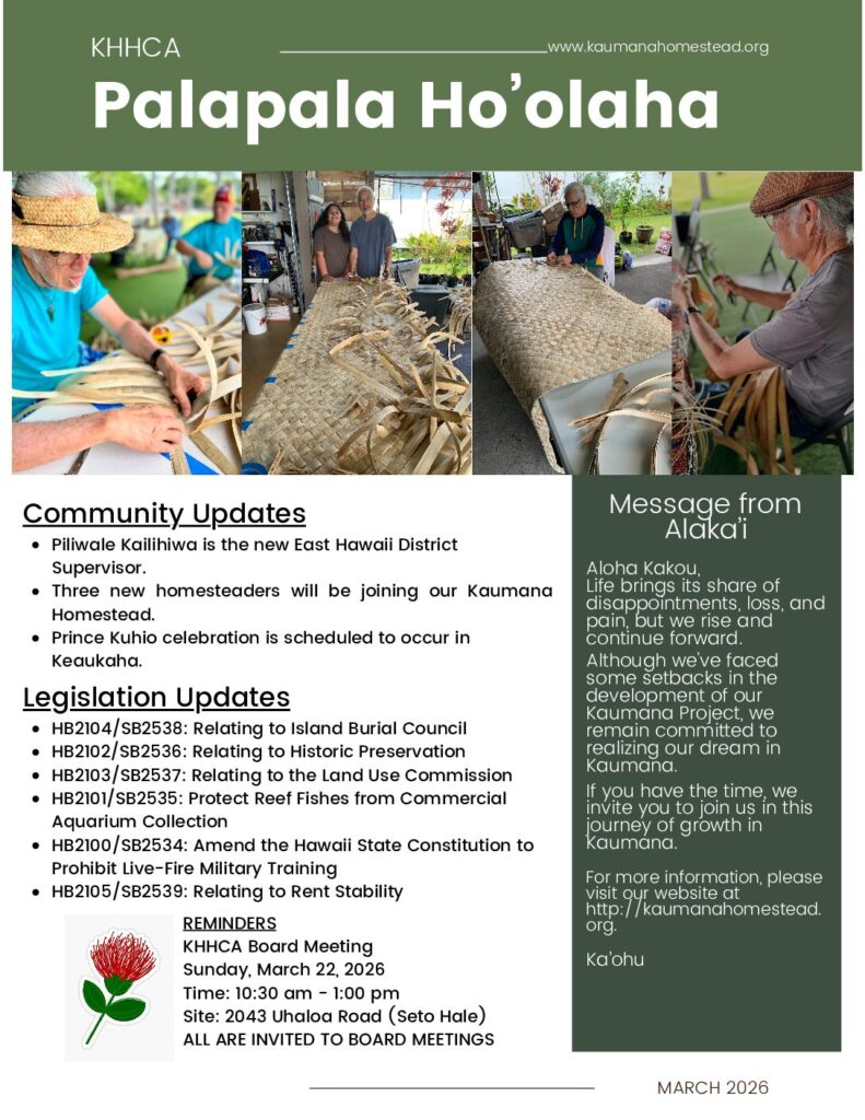 Inside you’ll find more information about KHHCA, the members, contact information, and information about the Hawaii Department of Hawaiian Home Lands and much more.